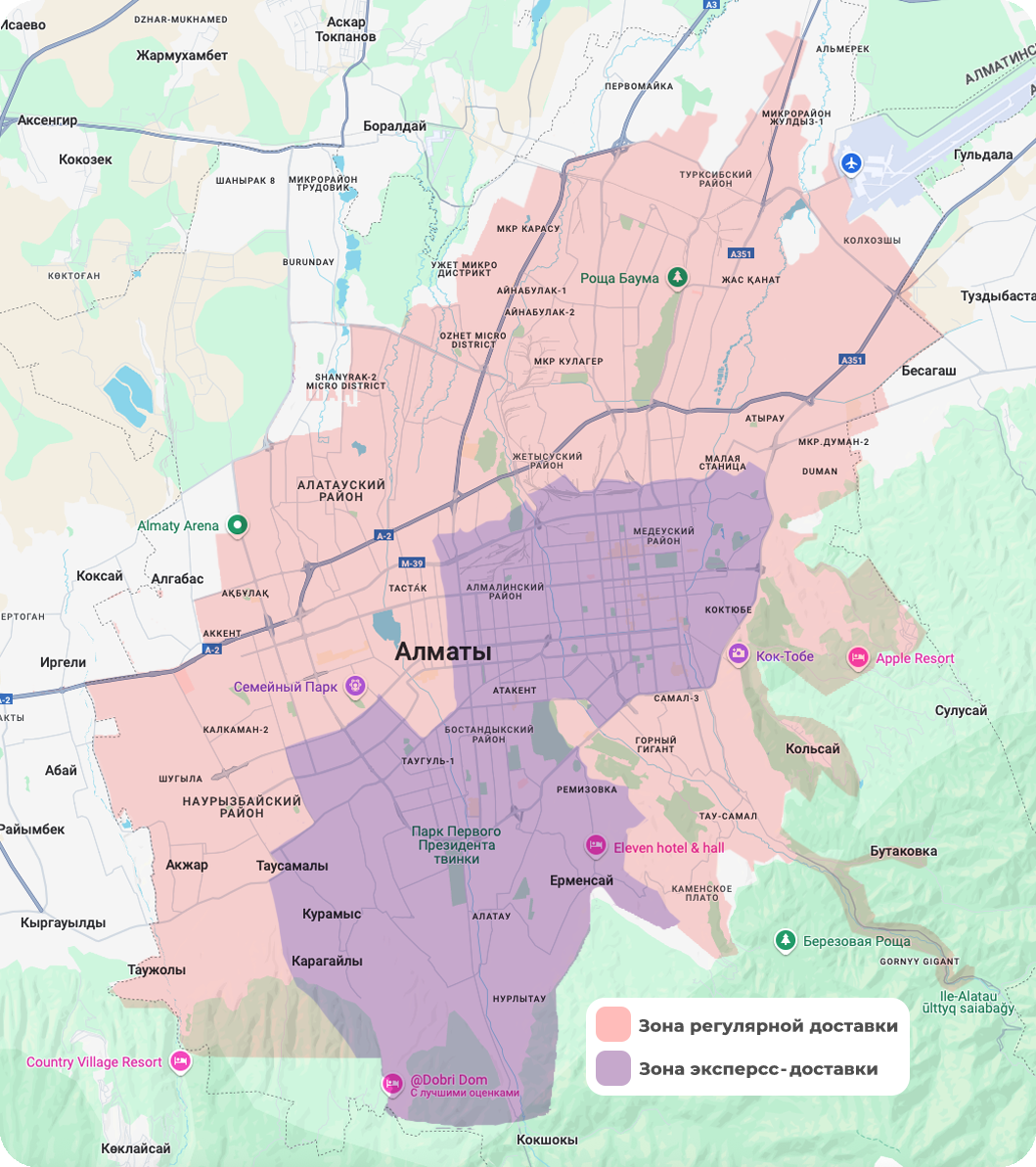 Стоимость экспресс-доставки за 60 минут – 900 тенге, заказы принимаются c 7:00 до 23:59.