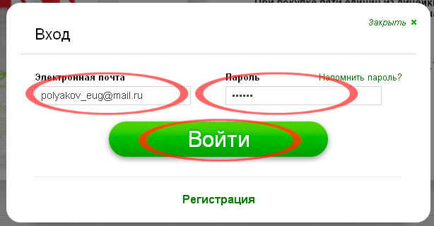 В этом окне нужно ввести адрес электронной почты и пароль, которые Вы указали при регистрации.  После того, как Вы ввели свои данные, жмите кнопку «Войти».